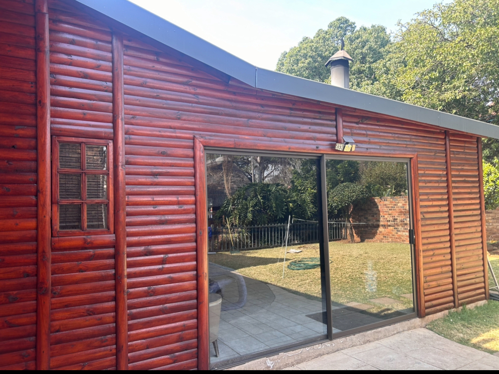 Build a log cabin for a client who requested an entertainment area adjacent to their house.